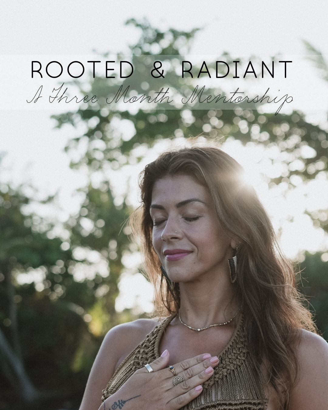 Rooted & Radiant is a three month intimate mentorship for women ready to deepen their practice, strengthen inner clarity, and embody steady feminine leadership in important times. Rooted in traditional yoga, meditation, and self inquiry, this container supports you in integrating wisdom into real life so you become anchored in yourself and naturally radiant from within.